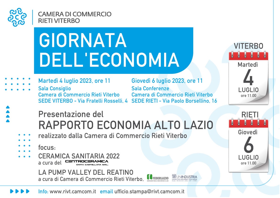 La Giornata dell'Economia si svolgerà a Viterbo il 4 luglio alle ore 11, presso la Sala Consiglio dell'Ente camerale di via Fratelli Rosselli, 4, e a Rieti il 6 luglio alle ore 11, presso la Sala Conferenze della Camera di Commercio in via Paolo Borsellino, 16.